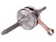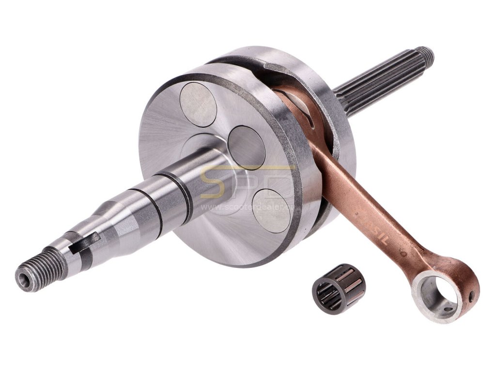 Top Racing Evolution versenyfőtengely fekvőhengeres Minarelli motoros robogókhoz. A Portugál gyártó felsőkategóriás versenyfőtengelye elsősorban komolyabban tuningolt robogókhoz / motorkerékpárokhoz ajánlott, természetesen ez nem egyenlő azzal, hogy sport tuninggal rendelkező kétkerekűekbe nem építhető be, hiszen azokhoz is maximálisan megfelelő, csak extra biztonságot jelent. Az Evolution változat már speciális, robosztus felépítésű hajtókarral, illetve könnyűfém centírbetétekkel érkezik. A könnyűfémmel (Alumínium, Wolfram, Réz) történő centírozási eljárásnak köszönhetően a főtengely még pontosabb kivitelben tud a vásárlókhoz jutni. Az új fejlesztésű hajtókar alsó szeme már nyitott, melynek következtében a karterben áramló keverék az alsó tűgörgőhöz is könnyedén bejut. Ennek akkor van kiemelten nagy előnye, ha az alkatrész extrém használatban van, és egy esetleges túlmelegedés veszélye áll fenn. Hasonló megoldás látható a felső szemnél is, hiszen ott is megtalálható az az olajozó furat ami komolyabb főtengelyeknél már elengedhetetlen. A gyártó a főtengelyhez mellékel egy HD, azaz extrém terhelés mellé tervezett speciális kialakítású felső tűgörgős kosarat is.