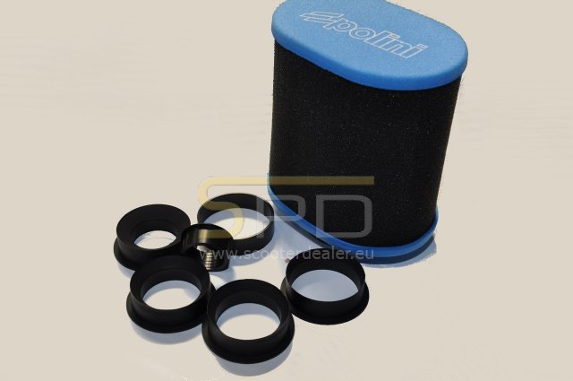 Polini Big Evolution Double Layer sportlégszűrő. Speciális felépítésű extra finom kialakítású sportlégszűrő. Az olaszországi Polini egyik legújabb fejlesztése. A sportlégszűrő merev házzal rendelkezik annak érdekében, hogy mindig maximális kapacitással tudjon üzemelni a motor, és ne fordulhasson elő olyan, hogy a szivacs összegyűrődik, lecsökken a felülete. A csomagban számos adaptert találhatunk, jelenleg nem létezik olyan karburátor amire ne lenne felszerelhető. Érdekessége még továbbá, hogy a légáteresztő merev váz a durvább és a finomabb szivacs közé van bei......